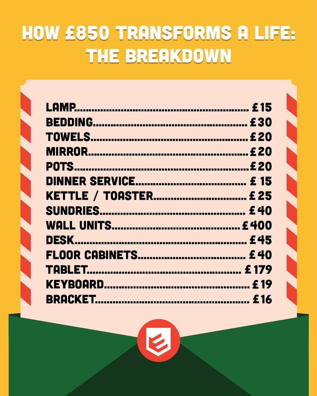 This list shows how far £850 goes to kit out a home, giving someone a fresh, safe and welcoming start.
